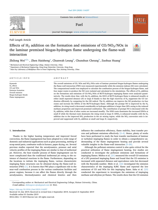 研究团队目前针对生物质气-氢气可再生能源的清洁高效利用,开展了广泛的基础应用研究,促进了对该可再生能源基础特性的认识和理解,为该可再生能源的清洁高效利用提供了多方面的理论支持。该研究得到了香港RGC项目(B-Q39F)和太阳成tyc122cc集团科研启动经费(KYQD(ZR)-1905)资助。