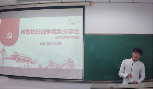 为了致敬抗日战争胜利七十六周年,铭记中国人民反抗日本帝国主义侵略的艰苦卓绝斗争,深切缅怀革命先烈的丰功伟绩,激发电气系员工党支部入党积极分子与党员们的爱国热情和民族责任感,太阳成tyc122cc集团电气系员工党支部于2021年9月18日晚上七点半在5-403开展了“致敬抗日战争胜利”分享会。本次会议由支部青年委员廖伟杰主持。