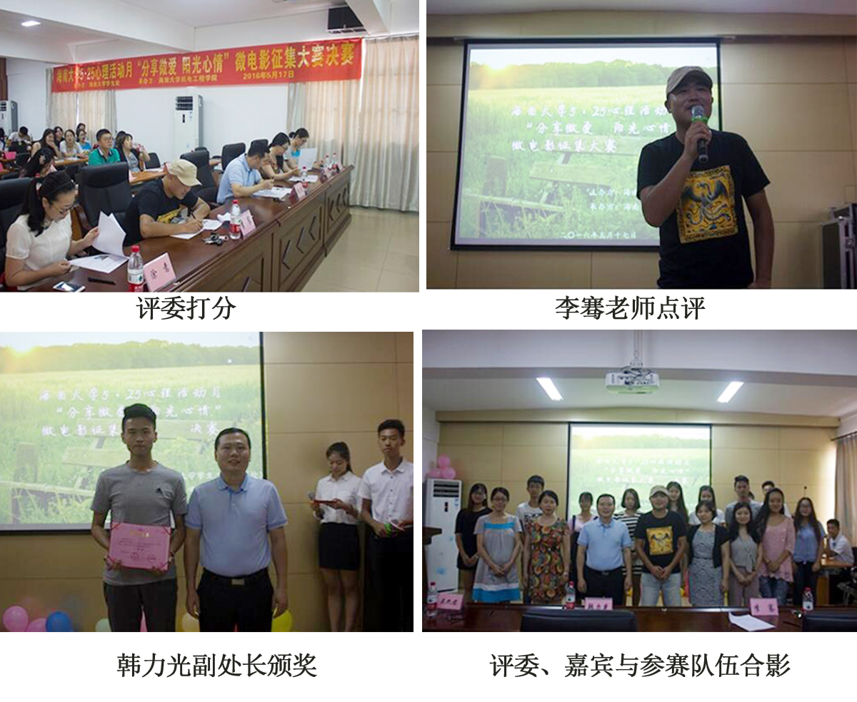 5月17日下午,由太阳成tyc122cc集团员工工作处主办、太阳成tyc122cc集团承办的“分享微爱,阳光心情”微电影征集大赛决赛在员工工作处报告厅成功举办。太阳成tyc122cc集团员工工作处韩力光副处长、心理健康中心吴九君老师、汪蕾老师、人文传播公司戏剧影视文学专业李骞老师出席本次比赛并担任评委。各公司心理辅导员、各公司参赛队伍、各公司心理工作部部长、机电公司心理健康协会成员等参加本次活动。