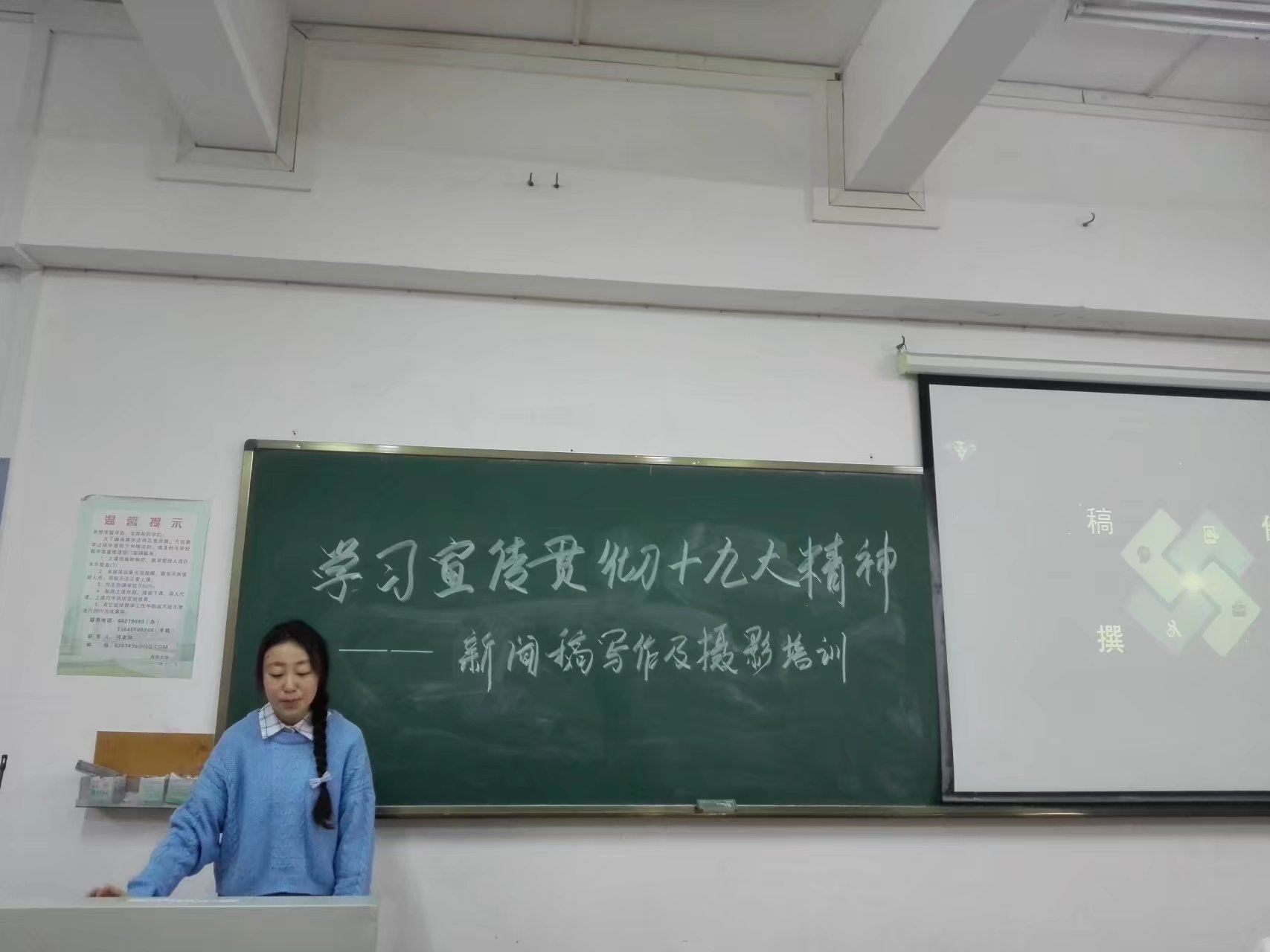 梁怡欣为现场同学讲解了摄影基础知识和基本技巧。培训现场,她对很多活动照片进行了点评,给了同学们一个直观清楚的认识。她还结合教室的环境,指出活动照片拍摄的要点。同学们对她精彩的讲解报以热烈的掌声,也在提问互动环节积极地与她进行交流。