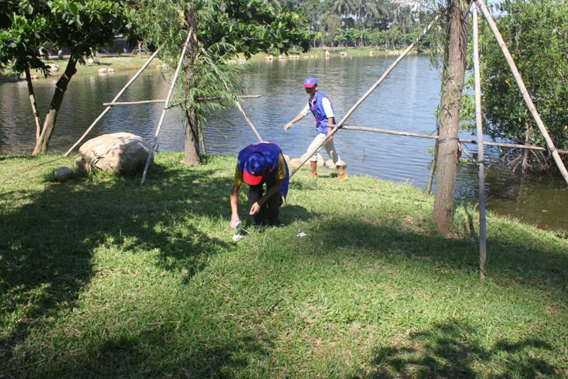 当日上午九点,志愿者们以公司东门为起点,沿东坡湖畔开始环境美化工作。放眼望去,湖畔似乎格外干净,但一路下来,烟蒂、一次性筷子、烟盒、塑料袋等还是占满了垃圾袋的有限空间。此外,志愿者们还将沿途的路灯和建筑物上的小广告进行了清除。