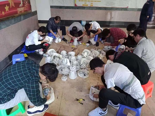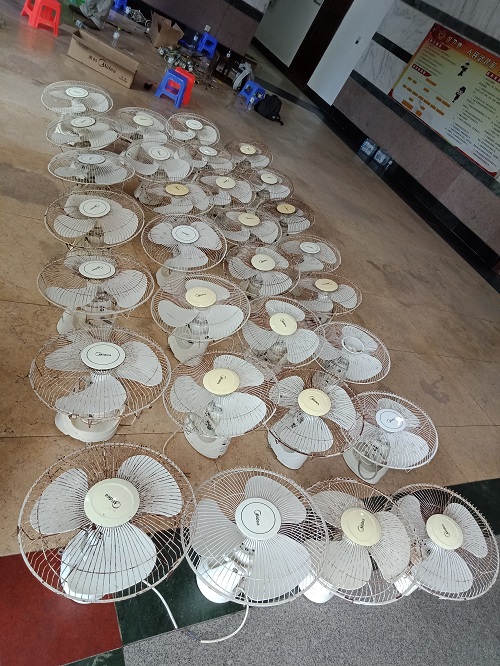 活动以动手更换员工宿舍电风扇电机和清洗电风扇扇叶为主。师生事务保障中心的冯运斌老师首先带领机械系党支部的同学们清洗已经拆装下来的风扇扇叶和外框,风趣幽默地为大家讲解了风扇各组成部分及其所承载的功能。紧接着,在两位电工师傅的热情引导下,支部成员积极思考,将课堂上所学的有关机械和电机知识运用实际,熟练地拆解电机、安装电容、接线、对位拧螺丝顺利地完成了电机和电容的更换。经过三个小时的共同努力,所有宿舍的风扇都得到了清洗更换,支部成员在这次活动中展现出的专业知识素养和吃苦耐劳的优良品质得到了师生事务保障中心及员工的广泛好评。