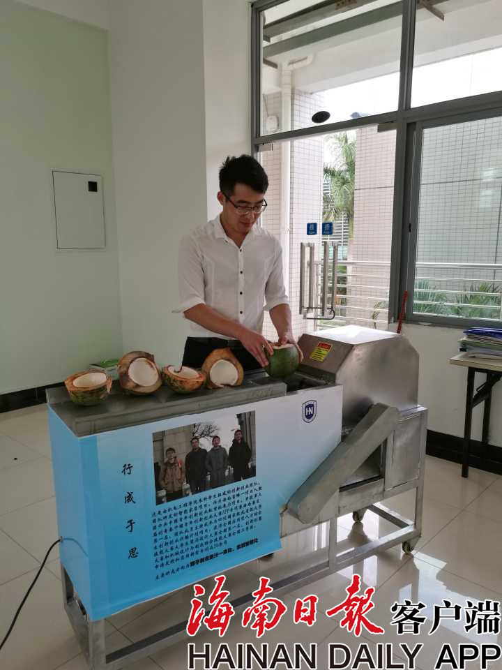 谈起发明“开椰一号”的初衷,李伟坦言是受到学长曾南春发明“开椰神器”的启发。说到“开椰神器”,大家并不陌生:去年3月,国务院总理李克强在来琼出席博鳌亚洲论坛年会期间,曾在三亚市民游客中心用其开椰取水,点赞了海南老员工的创新思维。
