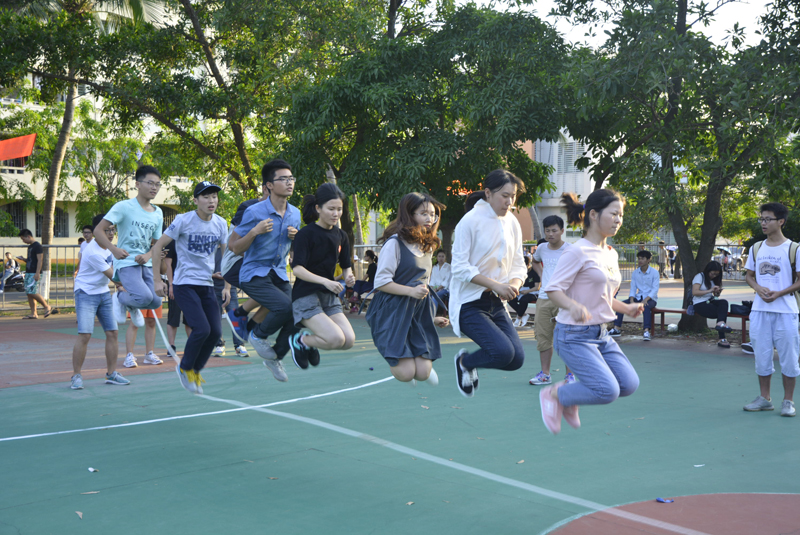 开幕式后,参加活动的各公司300余名员工在篮球场开始了“和频共振,互助向前”心理拓展活动。在“8字跳绳”比赛中,各公司学子积极参与,齐心协力,在合作中培养团队的凝聚力,在运动中疏导心情。