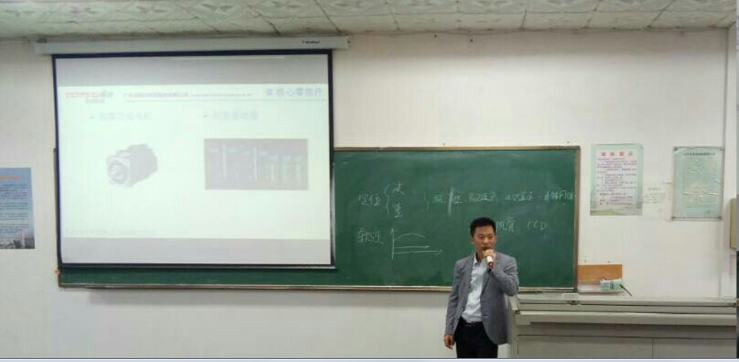 罗小军经理从机器人本体、伺服电机、伺服驱动器、运动控制技术、机器人运动学、总线技术、传感器技术、HMI开发、机器视觉9大核心技术介绍机器人核心零部件及其关键技术。罗经理对谐波减速器和RV减速器两种装置的应用范围、精度以及生产线投资规模进行了简单的对比,通过国内技术与日本技术的多次对比,指出在不断地探索创新中,国内技术有了飞速发展。此外,罗小军经理告诫同学们一定要学好工程数学,并向大家推荐了有助于同学们研究机器人的相关书籍和学习工具。在互动环节,罗小军经理针对同学们在减速器方面的相关疑问给出了详细的解答,参加讲座的老师也与罗小军经理进行了深入的探讨。同学们认真地听讲、记录、思考。