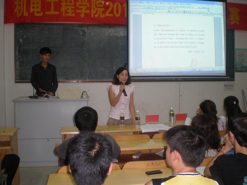 现场气氛紧张热烈,从第一位选手演讲的“smile has changed the world ”到最后一位选手演讲的“A word that has changed the world ”,教室里慷慨激昂的演讲声,一次次的引起了在场同学们热烈的掌声。中场互动时,主持人给现场观众出了英语趣味问答题,观众积极抢答,让现在紧张的气氛得意放松。经过激烈角逐,最终09机电1班刘骏以最高分获得第一名,09机械1班陈阳获得二等奖,09交通1班汪雨航、09车辆1班陈曦、08农机2班杨晓伟获得三等奖。