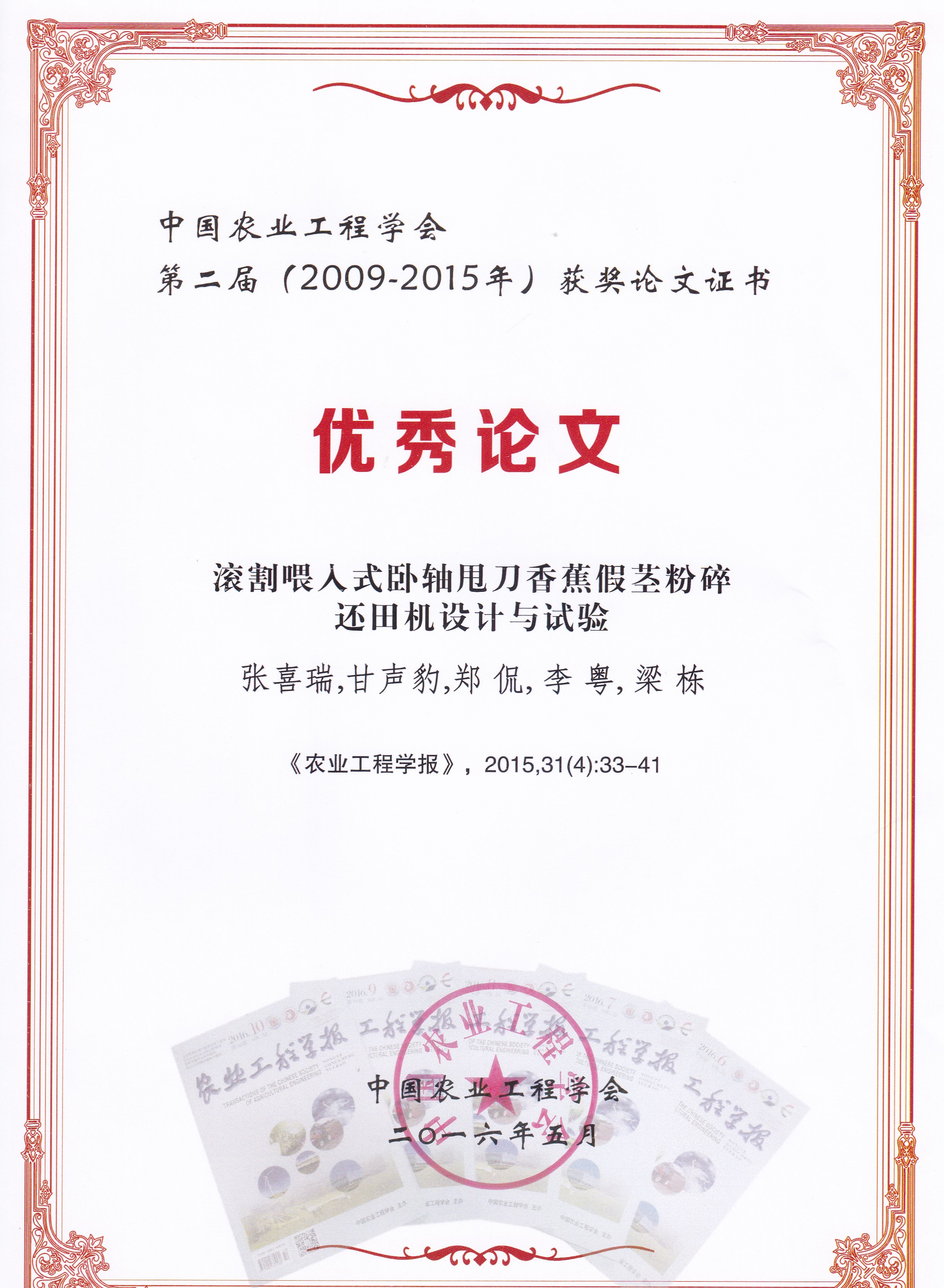 近日,公司热带作物秸秆机械化技术课题组两篇《农业工程学报》论文入选“中国农业工程学会第二届优秀论文”。两篇论文分别是“滚割喂入式卧轴甩刀香蕉假茎粉碎还田机设计与试验”(通讯作者:张喜瑞副教授)、“喂入式立轴甩刀香蕉秸秆粉碎还田机设计与试验”(通讯作者:李粤教授)。继2009年中国农业工程学会第一届优秀论文评选后,中国农业工程学会今年启动了第二届优秀论文评选。本届优秀论文评选范围是《农业工程学报》2009-2015年刊发的论文,优秀论文遴选采用文献指标定量与发表时专家评审意见定性相结合,提出候选论文,由中国农业工程学会组织专家评审。