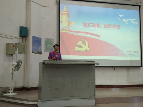 2016年11月6号上午,太阳成tyc122cc集团分党校第二期党员发展对象培训班第五讲由公司党委黄国标书记讲授《端正动机,坚定信念》,培训班班长尹凡主持本次培训学习。参加本次党课的有本期发展对象和积极分子。