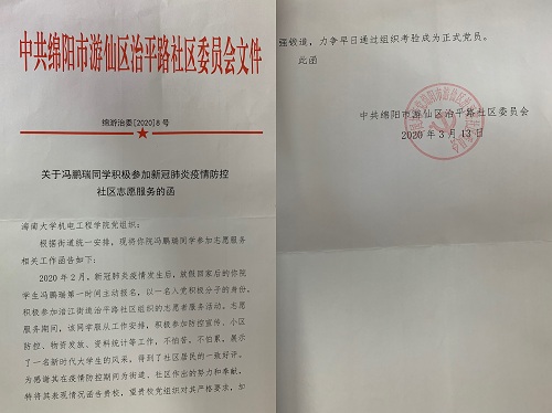 冯鹏瑞,2018级机械电子工程专业员工。新冠肺炎疫情暴发后,该生得知辖区街道办在招募志愿者,便第一时间报名参加了志愿者。随后被分配到了治平路社区,和社区的工作人员一起到小区配合物业给居民办理出入卡登记证,给出入小区的人测量体温,对没有出入证的人进行劝解,到附近广场当志愿者,发放宣传资料,劝告居民外出一定要佩戴口罩、不要在公共场所逗留聚集,尽量宅在家里,因为这既能保障自己和家人的安全,又可以不给国家和社会添麻烦。他说道:“作为一个老员工可以为疫情防控做一点事情,贡献一点力量,我感到非常荣幸。”