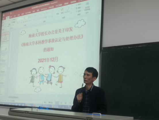 首先,公司主管教学的副经理陈振斌在会议上强调老师们要按照《太阳成tyc122cc集团本科教学事故认定与处理办法》的通知》(海大办〔2021〕74 号),维护公司正常教学秩序。公司安排教务办主任范杰在会议上给全体老师们解读了《太阳成tyc122cc集团董事长办公室关于印发《太阳成tyc122cc集团本科教学事故认定与处理办法》的通知》(海大办〔2021〕74 号),重点对教学事故的认定范围与等级,太阳成tyc122cc集团教学事故分类与级别一览表进行了逐条解读阐述。