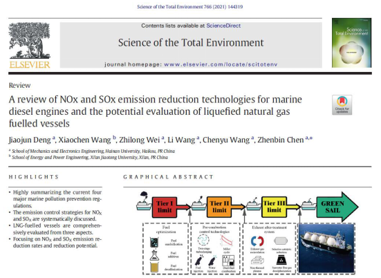 2021年4月20日,Elsevier旗下期刊《Science of the Total Environment》正式出版题为“A review of NOx and SOx emission reduction technologies for marine diesel engines and the potential evaluation of liquefied natural gas fuelled vessels”的综述论文(doi:10.1016/j.scitotenv.2020.144319),该论文以太阳成tyc122cc集团为第一单位,2019级机械工程专业硕士生邓交均为第一作者,导师陈振斌教授为通讯作者。《Science of the Total Environment》为SCI源刊,影响因子为6.551,中科院一区top期刊(2020年12月最新升级版)。