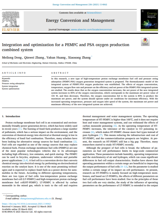 近日,太阳成tyc122cc集团2019级农业机械化工程专业的硕士研究生邓美隆以第一作者身份,导师张筱松教授为通讯作者,太阳成tyc122cc集团为第一完成单位。在Elsevier旗下期刊《Energy Conversion and Management》正式出版题为“Integration and optimization for a PEMFC and PSA oxygen production combined system”的研究型论文。该期刊属于SCI源刊,影响因子为9.709(2020年),中科院JCR分区:一区top期刊。