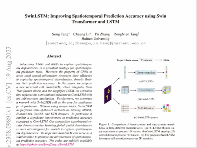 近日,院智能信息处理研究团队2021级硕士研究生唐松同学在唐荣年教授和李创教授的联合指导下,在国际顶级会议IEEE/CVF International Conference on Computer Vision(简称ICCV)上发表最新研究论文(如图1所示),题目为SwinLSTM: Improving Spatiotemporal Prediction Accuracy using Swin Transformer and LSTMICCV 是全球计算机领域顶级的学术会议,每两年召开一次,享有极高的学术声誉,本届会议共有 8068 篇投稿,接收率为26.8%