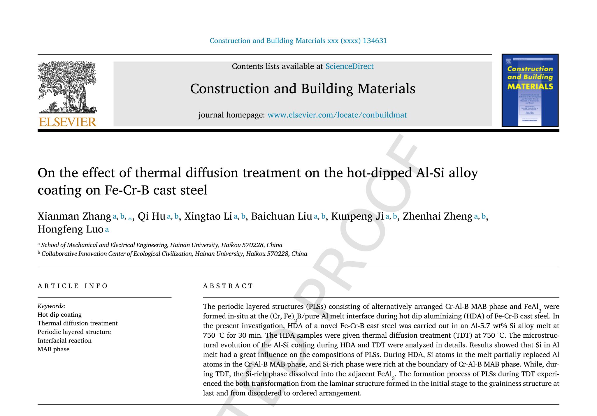 海南四面环海,诸如钢铁等金属材料都面临着严酷的海洋/海水腐蚀。在此背景下,该团队旨在利用热浸镀铝来提高金属材料的耐海水腐蚀性能。普通碳钢热浸镀铝会形成表面残留铝层/FeAl3(少量)/Fe2Al5(大量)//钢基体这种三明治结构,而新型Fe-Cr-B铸钢热浸镀铝则会在其组织中的(Cr, Fe)2B与Al界面上生成由FeAl3和Cr-Al-B MAB相交替排列的周期性层片结构(PLS)。然而,铝熔体中的合金元素对该界面反应的影响还不得而知。论文“Effects of Zn and Si on the microstructure evolution of the Cr-Al-B MAB phase contained in the periodic layered structure formed in-situ (Ceramics International, 2023, 228: 111813.)”研究了铝液中的Zn和Si对该界面反应生成PLS中的Cr-Al-B MAB相的影响,发现Zn、Si都可部分置换Cr-Al-B MAB相中Al原子并在A位置形成固溶体,且Zn可增厚该MAB相,Si则起到减薄的作用。论文“On the effect of thermal diffusion treatment on the hot-dipped Al-Si alloy coating on Fe-Cr-B cast steel (Construction and Building Materials,DOI:https://doi.org/10.1016/j.conbuildmat.2023.134631)”重点研究了铝液中的Si以及扩散热处理对该PLS镀层的影响,发现热浸镀铝时Si主要以单质Si的形式富集在Cr-Al-B MAB相的周围,而扩散热处理时,Si则向临近的FeAl3扩散,并且PLS的形成同时经历从无序到有序、片状到颗粒状的转变。